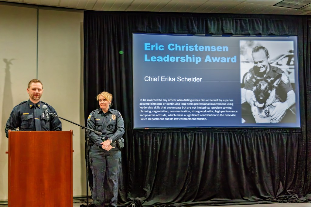 Chief Erika Scheider was awarded the Eric Christensen Leadership Award. This is awarded to any officer who distinguishes him or herself by superior accomplishments or continuing long-term professional involvement using leadership skills that encompass but are not limited to: problem solving, planning, organization, communication, strong work ethic, high performance and positive attitude, which make a significant contribution to the Roseville Police Department and its law enforcement mission.